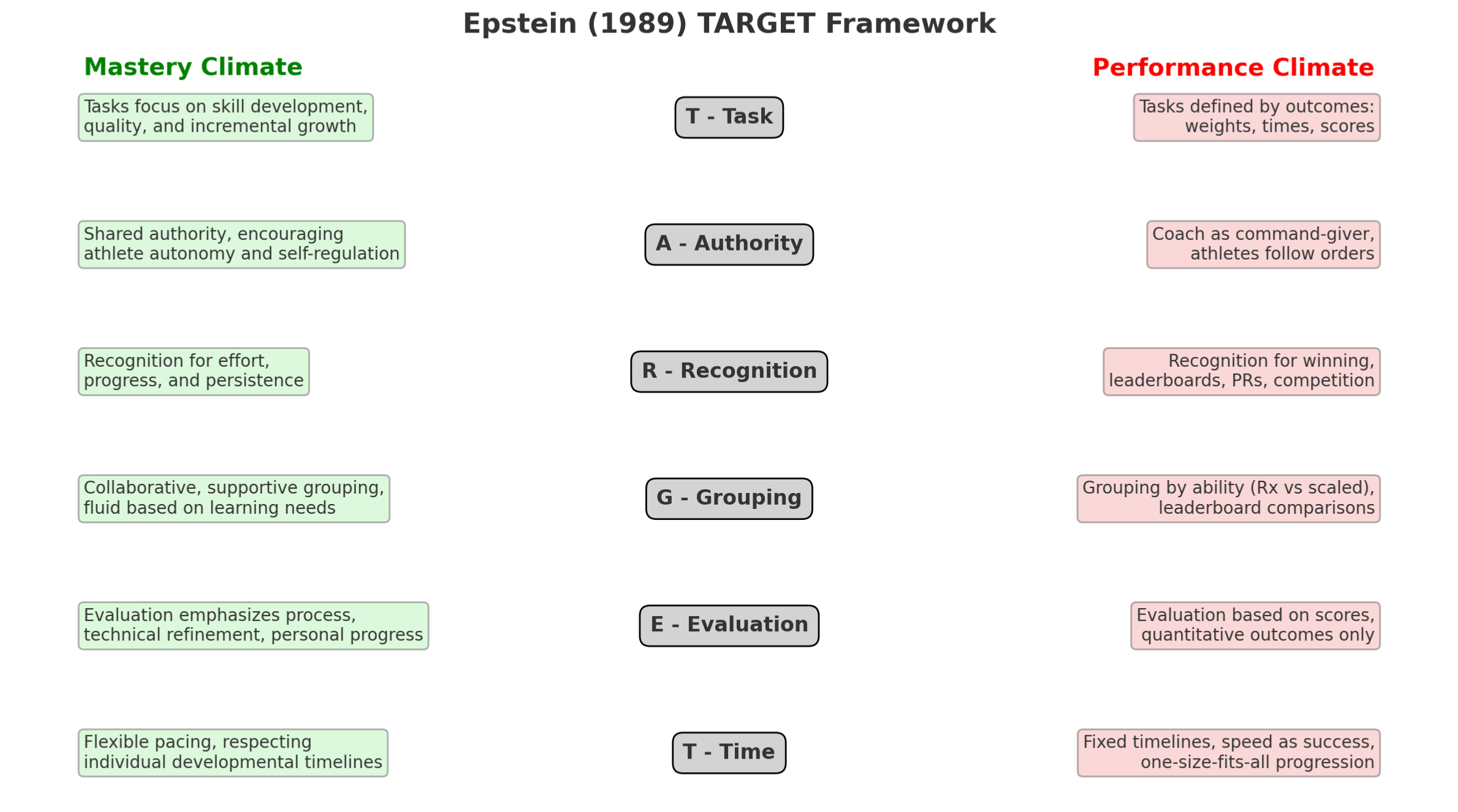 By contrast, a mastery climate emphasizes individual progression, learning, and autonomy. If we apply Epstein’s TARGET framework—Task, Authority, Recognition, Grouping, Evaluation, and Time—we see how CrossFit education has tilted almost exclusively toward performance, and how coaching could evolve to better support mastery.